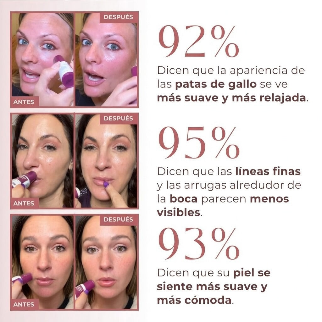 Este bálsamo de bolsillo actúa sobre esas zonas en segundos. Una sola pasada proporciona una oleada de calcio para reforzar la estructura de la piel, adenosina para rellenar visiblemente las líneas y colágeno + elastina para devolverle la elasticidad. El contorno de ojos se ve menos hundido, las líneas de expresión se ven más suaves y el "código de barras" del labio superior se ve suavizado, sin grasa ni residuos.